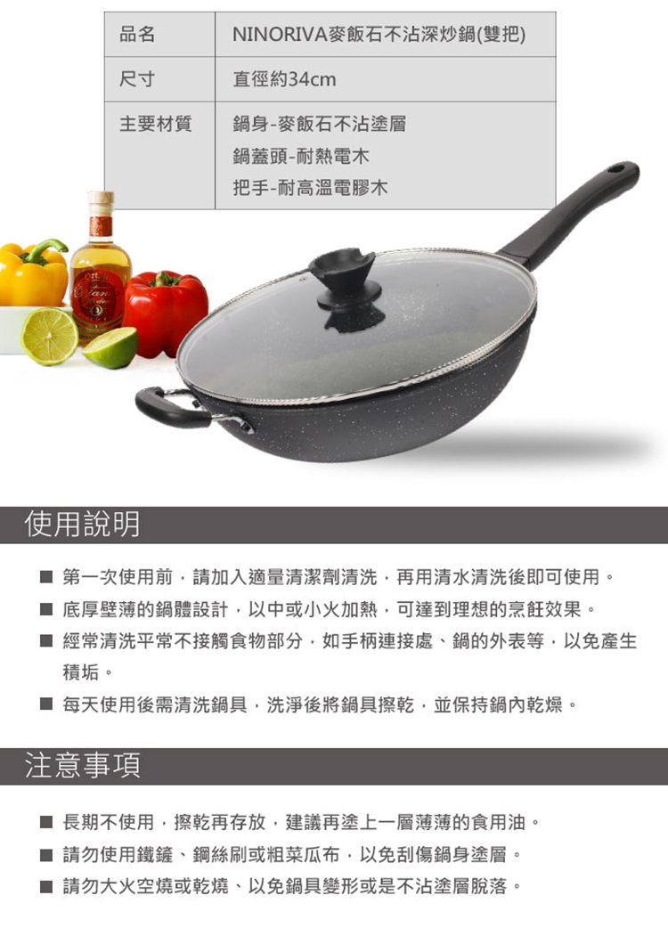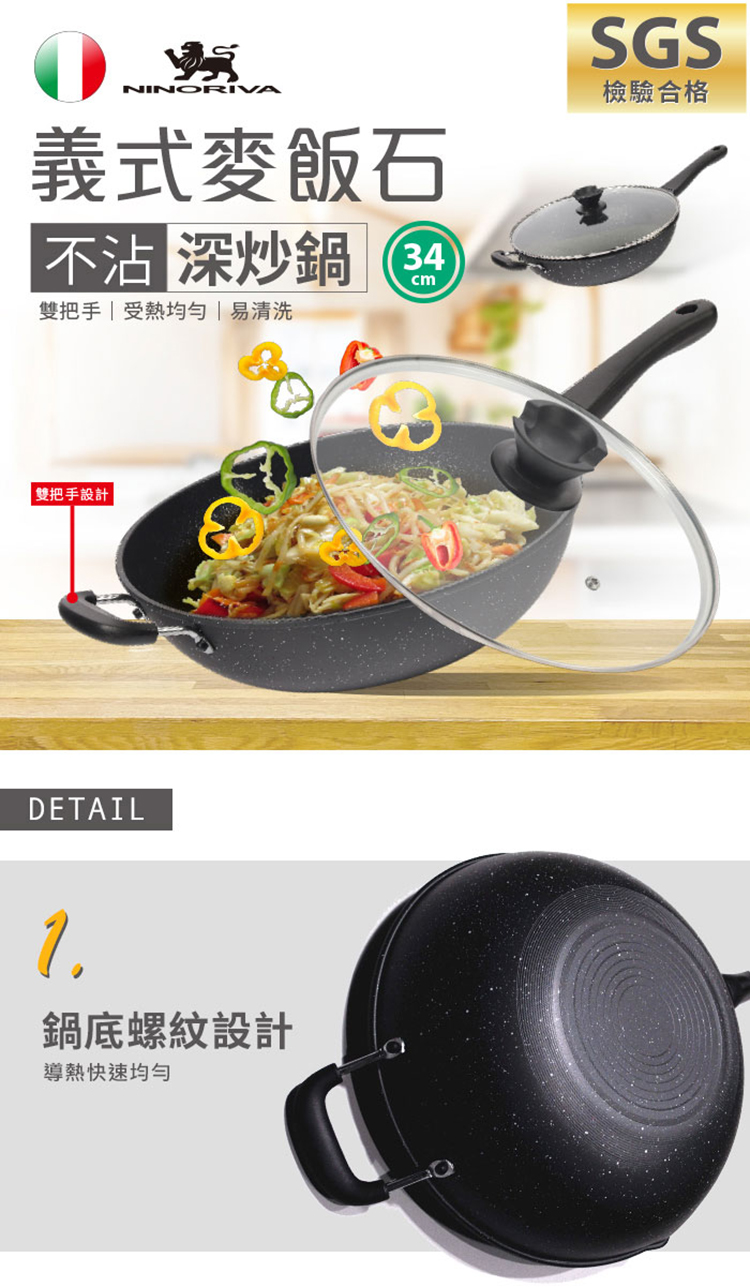 【NINORIVA 尼諾里拉】義式麥飯石34cm不沾深炒鍋
